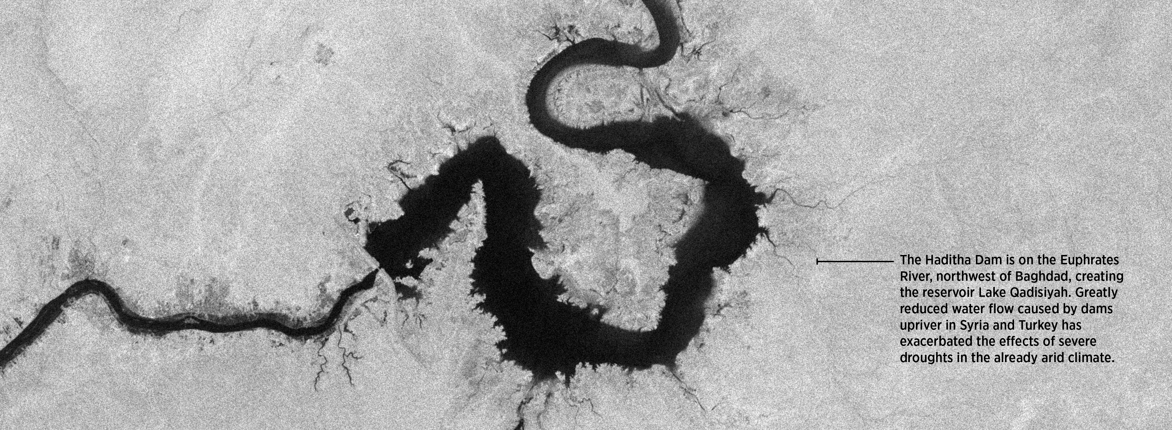The Haditha Dam is on the Euphrates River, northwest of Baghdad, creating the reservoir Lake Qadisiyah. Greatly reduced water flow caused by dams upriver in Syria and Turkey has exacerbated the effects of severe droughts in the already arid climate.