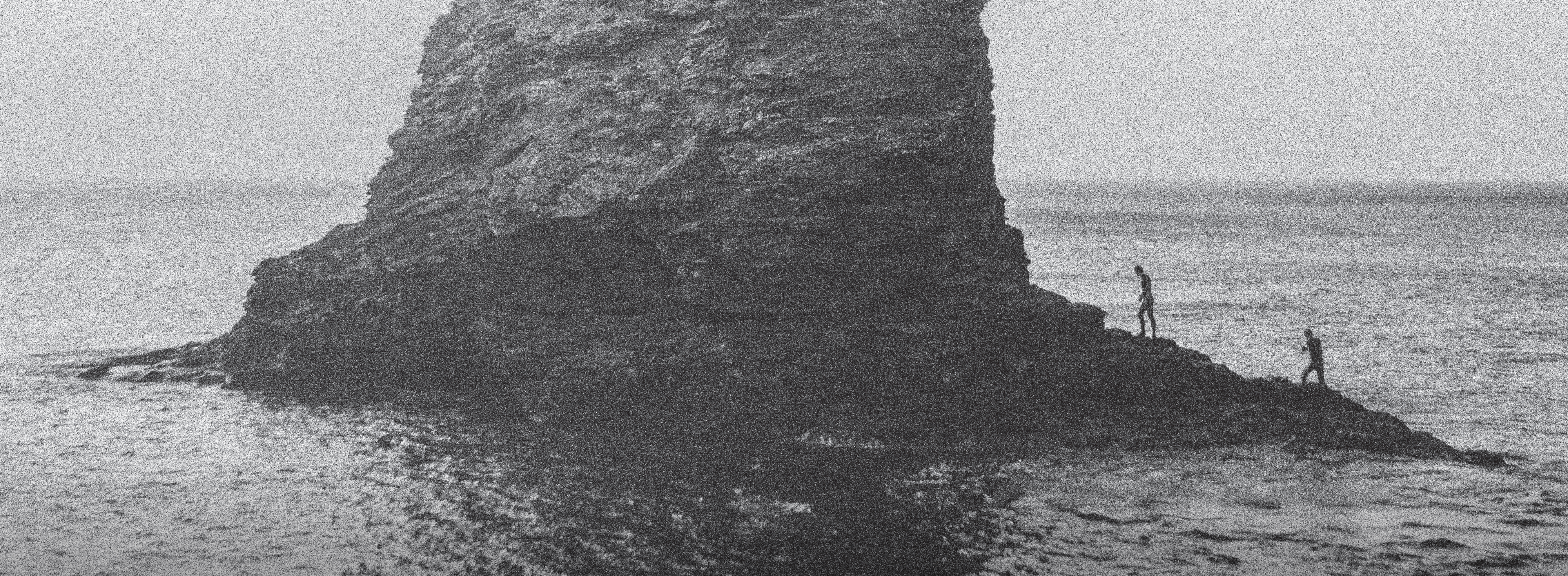 Searching for imagery on Unsplash, I came across a photograph by Matt Cannon of two surfers on an island. When I converted it to black and white, added some grain, and a little photoshop seasoning its mood changed. The figures became Alberto Giacometti-inspired characters exploring the shore. The island morphs into a mythical windswept limestone tooth with jagged razor-sharp ridges breaching the sea.