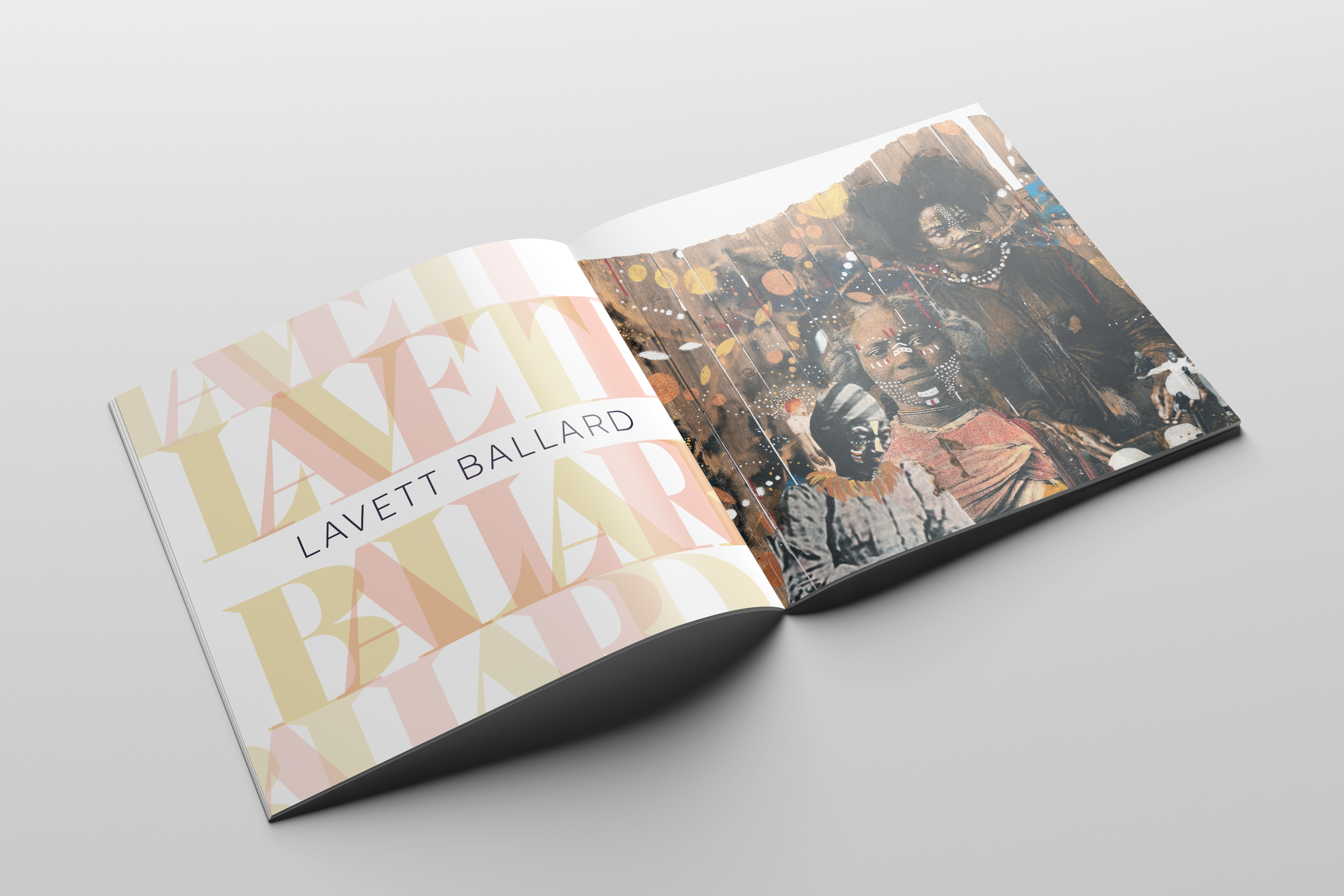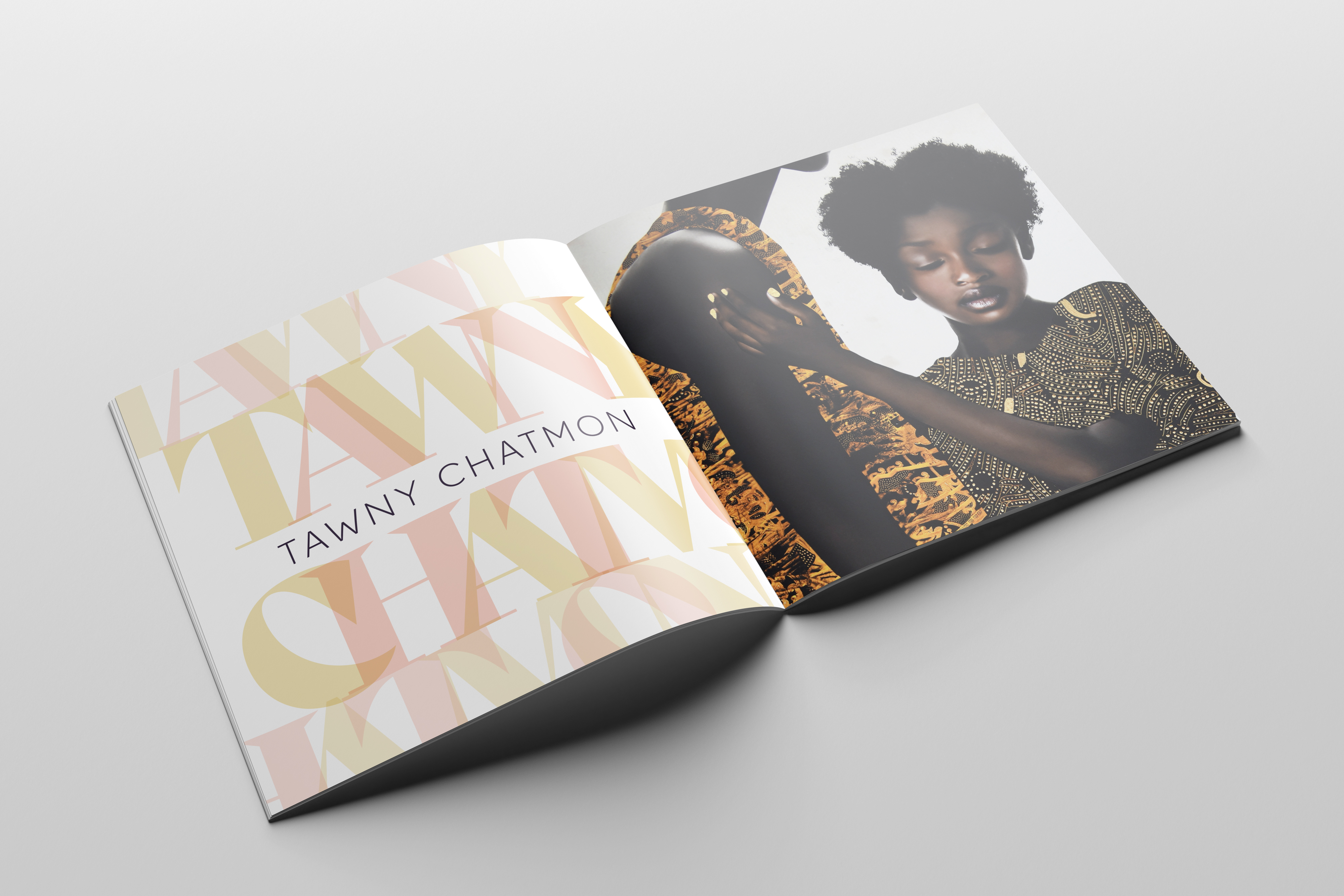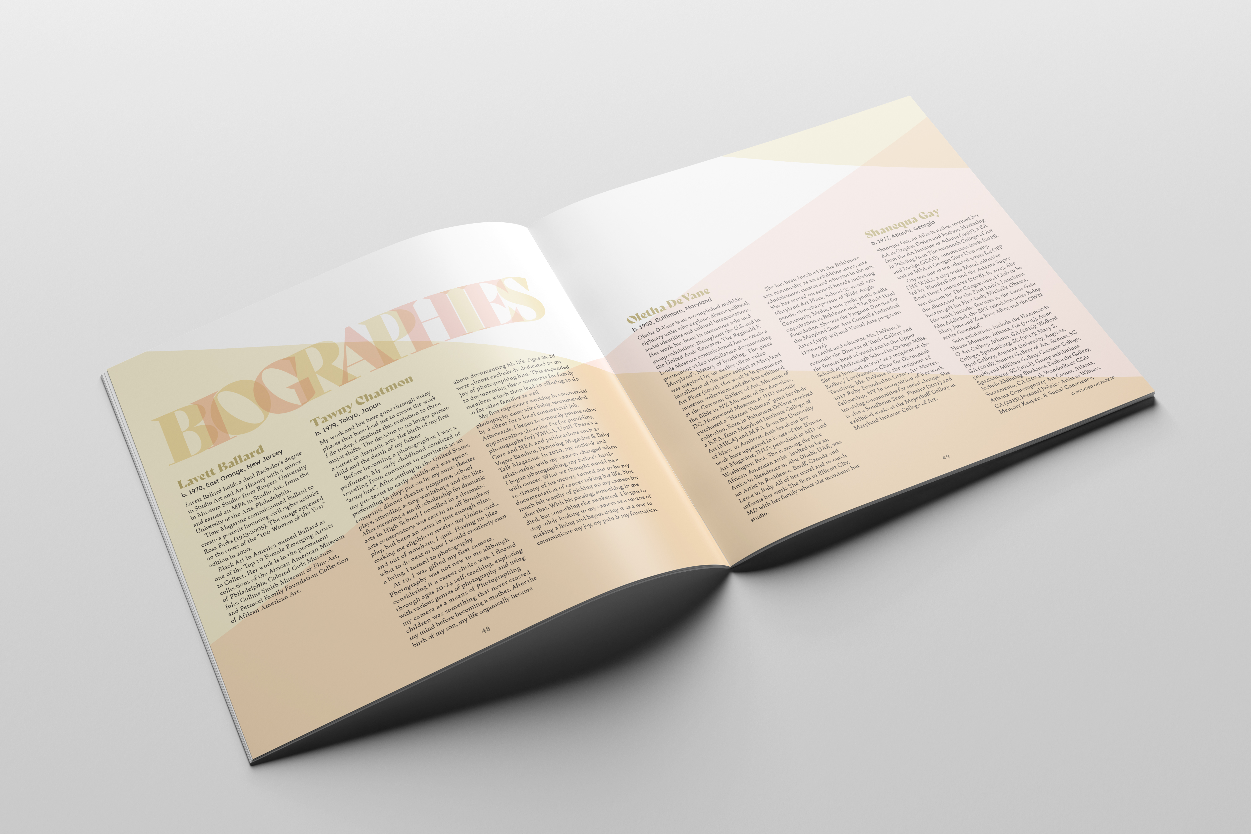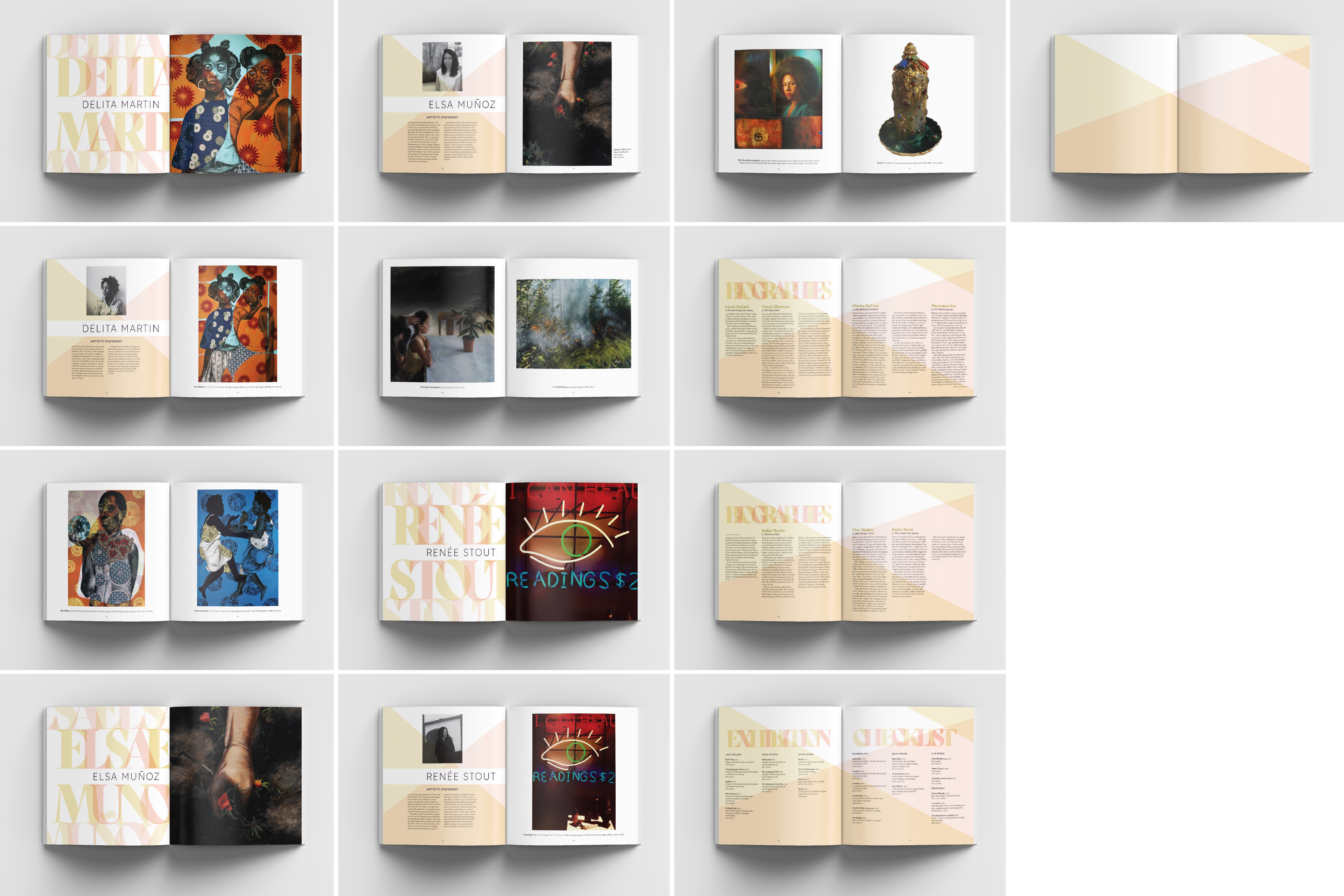 The concept is echoed in the transparent overlapping of letters in the names and titles throughout the catalogue. However, each name repeats in a highly legible treatment that clearly expresses their names.